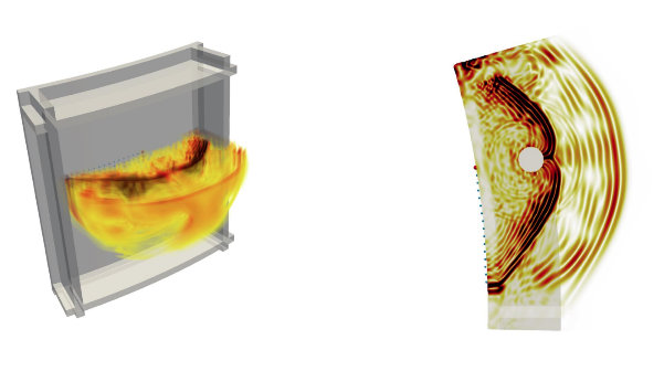 Figure 2: When introducing a spherical void into the concrete, most of the wavefront passes past the void, but a small amount is reflected.