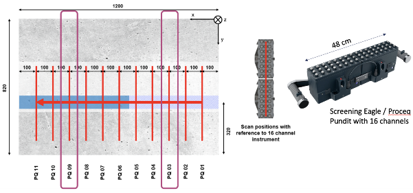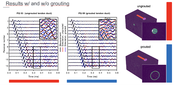 To test whether full waveform inversion improve the consistency of ultrasonic data interpretation we ran a controlled study on a reinforced concrete test block built by Screening Eagle Technologies | Proceq where the duct grouting condition was precisely known.
