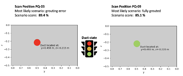 Figure 3: Quantification of PT duct grouting. Green indicates high correlation with grouted scenarios. Red denotes high correlation with ungrouted voids scenarios. This framework translates complex Salvus wavefield workflows into traceable and actionable displays for standardized asset integrity assessment.